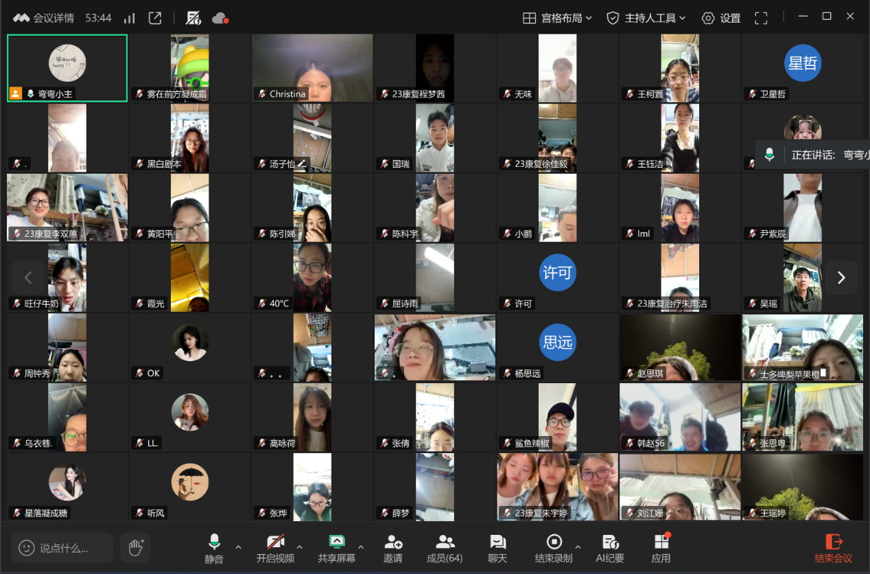 为进一步加强学生对考研的认识和了解,明确考研规划和目标,营造良好的考研学习氛围,2025年10月24日晚我院在腾讯会议举办线上“医路研途”学长学姐考研经验分享会。活动邀请22届康复治疗学专业校友张跃跃、25届护理学专业校友蔡修燕作交流分享,大三全体学生参加。会议由学工办主任董弯主持。