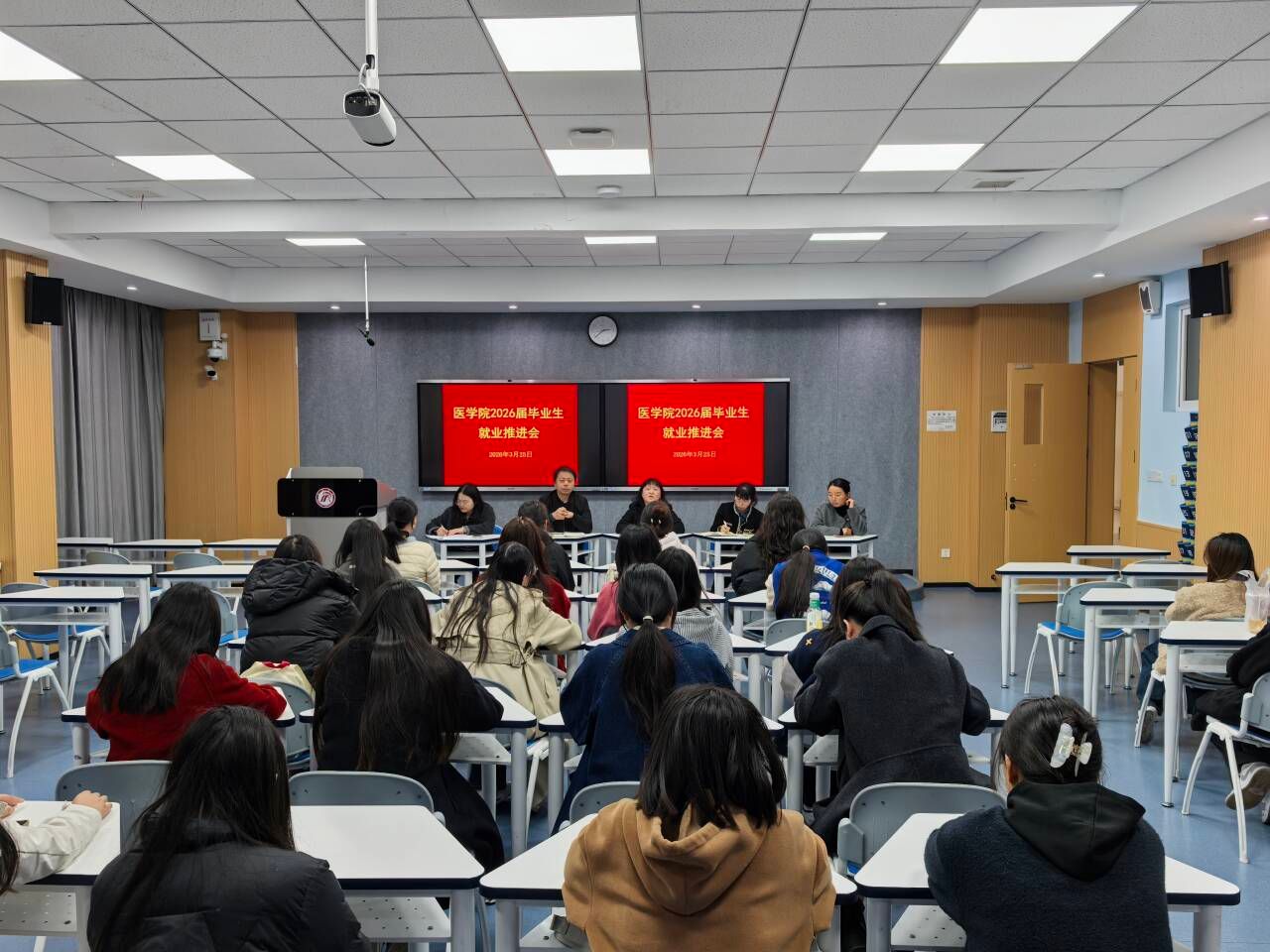为深入贯彻落实毕业生就业工作部署,精准把脉就业形势,统筹推进2026届毕业生高质量充分就业,3月25日下午,我院召开2026届毕业生就业推进会。医学院党总支书记黄勇、院长谢娟平、副院长陈佳、护理系主任白玉玲及2026届全体毕业生参会。会议由学工办主任董弯主持。