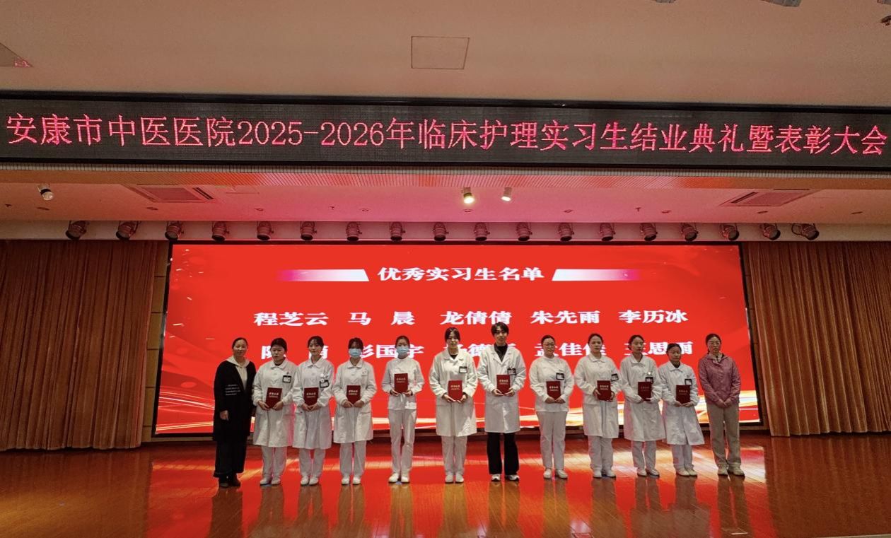 2026年3月5日下午,安康市中医医院隆重召开2025—2026年度临床护理实习生结业典礼暨表彰大会。安康学院医学院教学副院长陈佳、实习指导教师陈玲、护理系教师栗果出席本次大会。