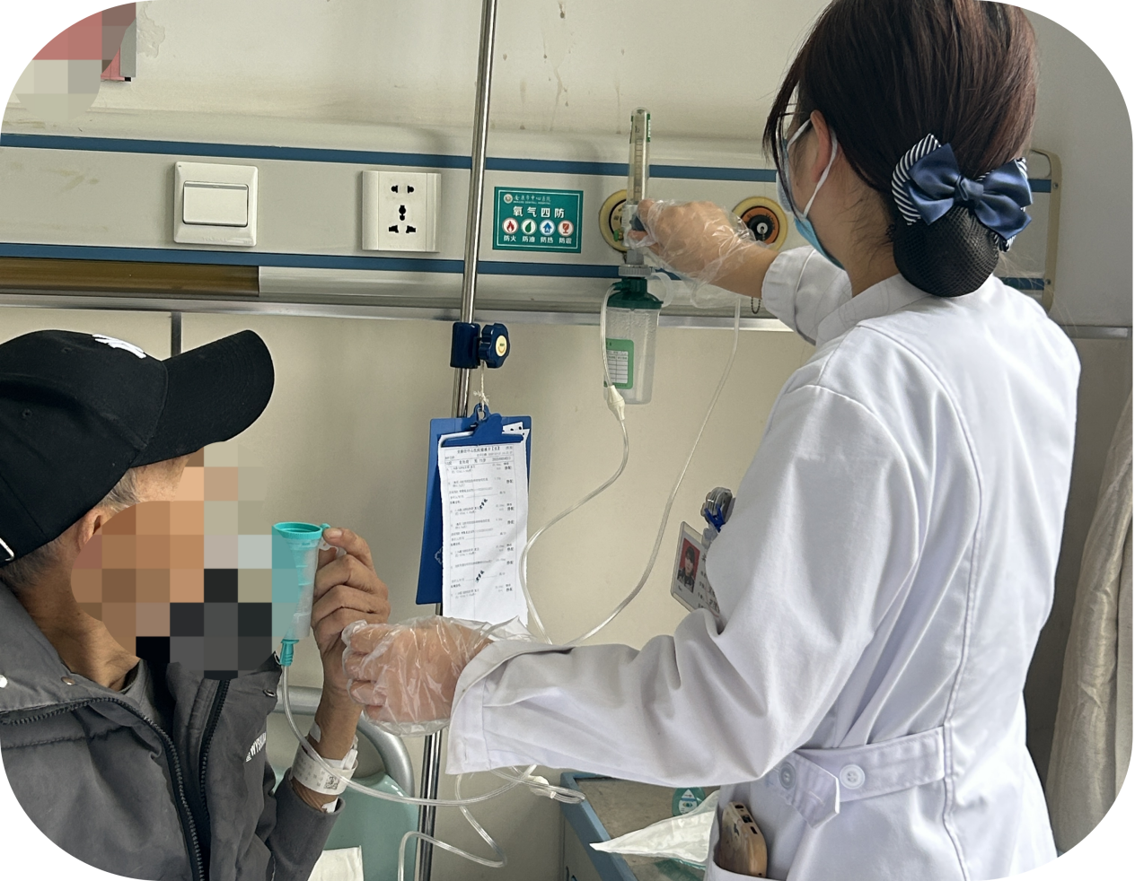 在骨科以及呼吸科实习期间,我的生活也很充实。骨科相对来说是一个手术较密集的科室,我见到了各类骨折,老师指导我们要为患者要做好术前的准备,并且做好术后的一个护理和早期康复锻炼等。老师对我们也是一种放手不放眼的态度,要求我们对待患者做到“三个心”和“四个勤”即爱心、耐心、细心,眼勤、手勤、脚勤、嘴勤。转入呼吸科后,患者几乎都是呼吸道的问题,雾化治疗每天必做之一。期间,我打了实习期间的第一个留置针,那是为一位70多岁的老爷爷,我在为他进行静脉输液时没有成功,正当我紧张惶恐之际,老爷爷立刻伸出另外一只手笑着对我说:“没事儿,继续来,小姑娘不怕,技术都是练出来的。”那一刻我既愧疚又感动,他们愿意给我们试错的机会,他们的包容比教科书更教人勇敢,所以我们也应不遗余力地做到最好,不辜负他们的信赖。